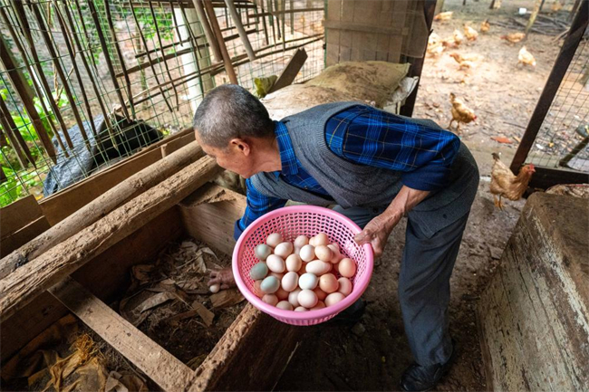 A villager collects eggs in Sanwang Village, Guyuefeng Town on April 15. (Photo/Chen Sihan, Xinhua)