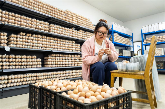 A staff member packages eggs at the Qianjiadan Breeding Cooperative in Guyuefeng Town on April 15. (Photo/Chen Sihan, Xinhua)
