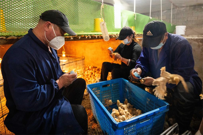 Staff members of the chicken breeding cooperative vaccinate chickens in Yuefeng Village, Guyuefeng Town on April 15. (Photo/Chen Sihan, Xinhua)