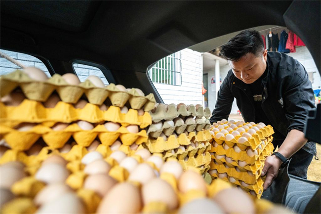 A staff member of the chicken breeding cooperative carries the freshly collected free-range eggs onto a van in Zhaoshan Village, Guyuefeng Town on April 15. (Photo/Chen Sihan, Xinhua)