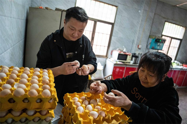 A staff member (L) of the chicken breeding cooperative purchases free-range eggs at a farmhouse in Zhaoshan Village, Guyuefeng Town on April 15. (Photo/Chen Sihan, Xinhua)