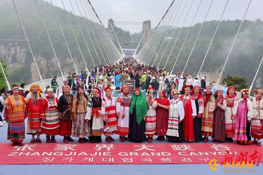 On April 14, the 2026 China-Russia International Cultural Exchange Event (Golden Square · Zhangjiajie) held a rehearsal and a folk fashion show competition at the Zhangjiajie Grand Canyon Scenic Area. More than 300 professional and folk artists from 11 regions of Russia staged performances, alongside local intangible cultural heritage inheritors. Over 100 sets of traditional Chinese and Russian clothes made a stunning appearance on the mist-shrouded glass bridge, attracting numerous tourists to take photos.
