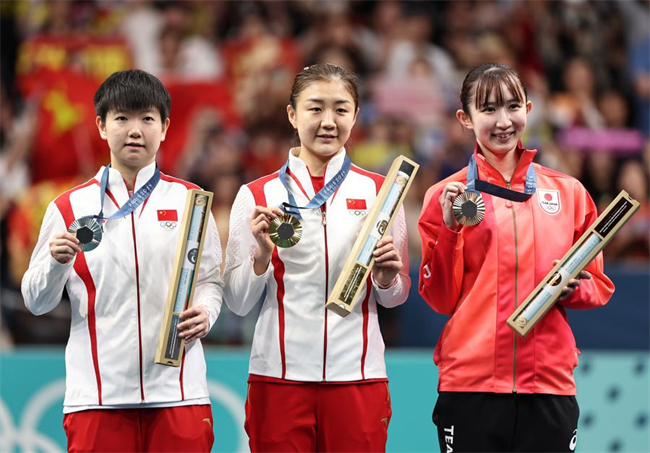 Gold medalist Chen Meng (C) of China, silver medalist Sun Yingsha (L) of China and bronze medalist Hayata Hina of Japan attend the award ceremony for the women's singles table tennis event at the Paris 2024 Olympic Games on Aug. 3, 2024. (Xinhua/Wang Dongzhen)