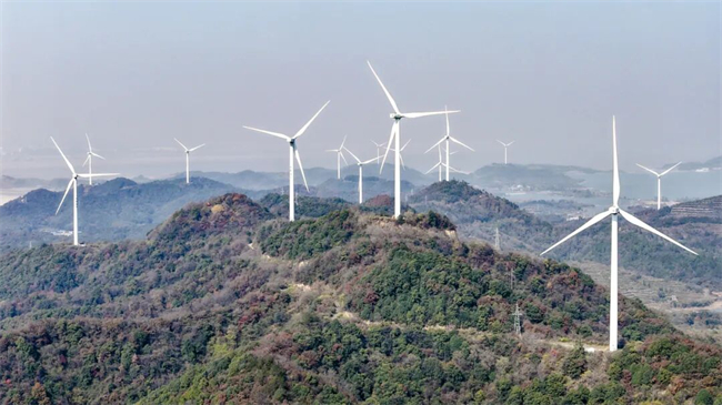 Wind turbines in Gaoqiao village, Shunde township, Hukou county, Jiujiang city, east China's Jiangxi Province, Dec. 3, 2025. (Photo/Zhang Yu)