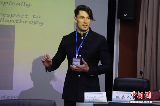 The photo, taken on September 27, shows Jordan B. Martin giving a presentation at the International Conference on Classical Studies in Eastern and Western Philosophy hosted by Zhengzhou University. (Photo provided by the interviewee)