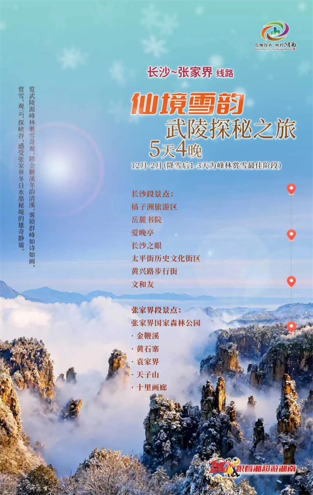 The Hunan Provincial Department of Culture and Tourism has launched four premium winter routes, each spanning five days and four nights. These journeys take you from the bustling old streets of Changsha to the winter wonders of Chenzhou, Huaihua, Yiyang, and Zhangjiajie. Each route promises a unique winter romance.