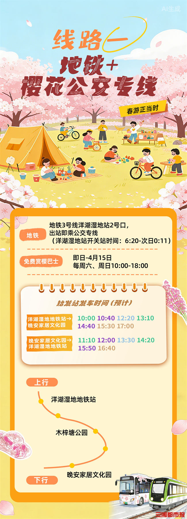 The special shuttle bus line for cherry blossom viewing has been open exclusively on weekends, to facilitate both residents and tourists' spring outings. The bus will depart from Exit 2 of the Yanghu Wetland Station on Metro Line 3 (operating hours: 6:20 to 0:11 the following day), and run every Saturday and Sunday from 10:00 to 18:00 from the launch date through April 15. The bus line makes direct access to the Wan'an Home Furnishing Cultural Park—Changsha's top spring cherry blossom destination—with a stop at Muzitang Park along the way.