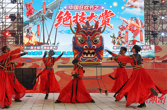 On September 29, a National Day celebration featuring spectacular skills kicked off at the Window on the World, Changsha. Intangible cultural heritage performances such as the duo high-pole stunts and Miao ethnic group's "Walking on Blades" were staged one after another. Joining spherical cinema, and other modern tech experiences, they created a festive feast that blends tradition and innovation for tourists. (Photo/Xu Xing, Hunan Daily)