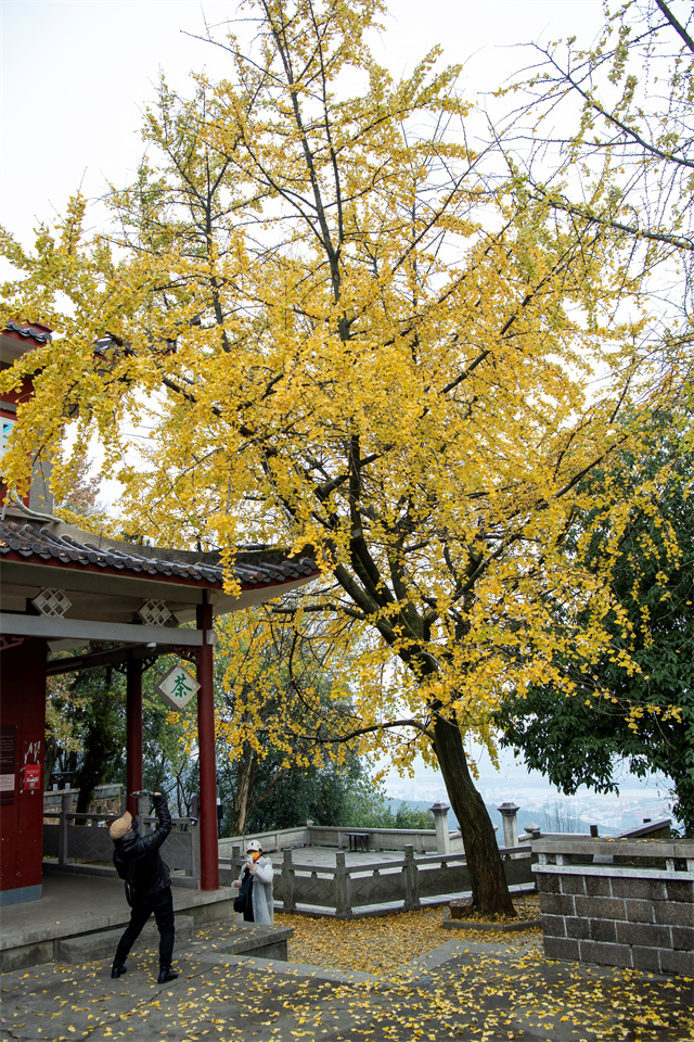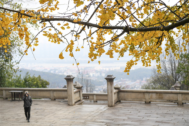 The photo, taken on December 1, shows a tourist taking photos of an ancient ginkgo tree in front of Yunlu Temple at Yuelu Mountain Scenic Area, Changsha City. Recently the ginkgo tree has entered the best viewing time. Its fan-shaped leaves have turned golden yellow, attracting many tourists. (Photo/Gu Pengbo, Hunan Daily)