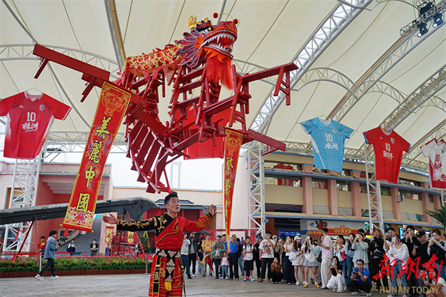 On September 29, a National Day celebration featuring spectacular skills kicked off at the Window on the World, Changsha. Intangible cultural heritage performances such as the duo high-pole stunts and Miao ethnic group's "Walking on Blades" were staged one after another. Joining spherical cinema, and other modern tech experiences, they created a festive feast that blends tradition and innovation for tourists. (Photo/Xu Xing, Hunan Daily)