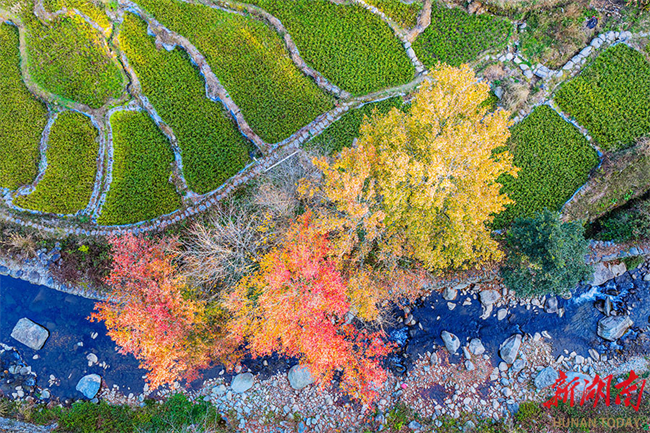 The ancient maple trees in Chang'anying Town, Chengbu Miao Autonomous County has entered prime view period in recent days. The photo, taken on December 15, shows the red and yellow maple leaves glistening under warm winter sunshine, making wood upon wood in a deep dye. (Photo/Shi Menglei)