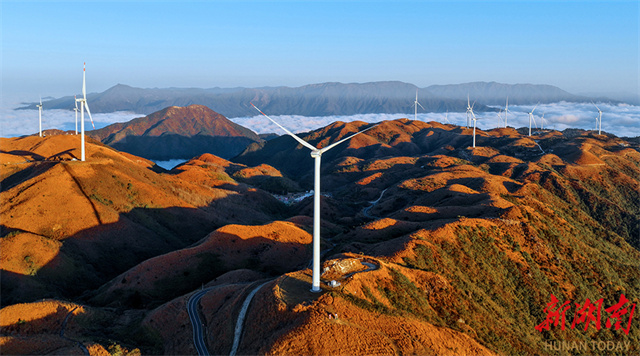 At dawn on December 17, wind turbines, a sea of clouds, and blue skies together formed a harmonious winter sunrise scene featuring natural beauty and modernity atop Wanyang Mountain in Guidong County. (Photo/Deng Renxiang)