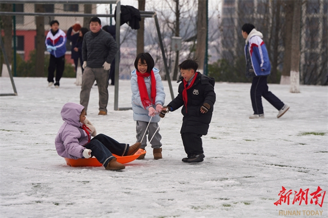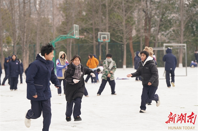 On January 21, students at Zengguofan School in Shuangfeng County stepped out of their classrooms during the inter-class breaks, to enjoy playing in the snow. (Photo/Zhang Changhui)