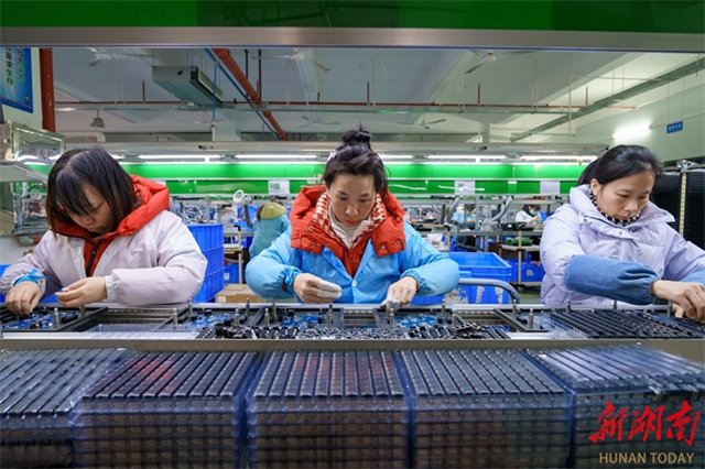On January 22, workers ramped up production for orders on the production line at the workshop of an electronic technology company in Lengshuitan District, Yongzhou City. Since the beginning of the new year, enterprises across the district have been working at full capacity to meet production targets, striving to achieve a good start for the new year. (Photo/Lei Zhongxiang and Jiang Lingzhi)