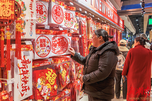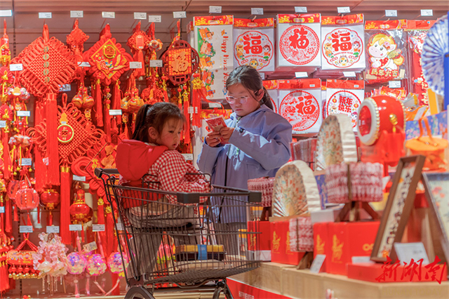 On January 25, local residents selected New Year decorations at the Changsha Mexi Xintiandi Shopping Mall. As the Spring Festival approaches, Changsha's holiday shopping market has reached its peak, with an array of festive goods on display. Enthusiastic shoppers are filling the shopping malls with a joyful and festive atmosphere. (Photo/Cai Xiaoping)