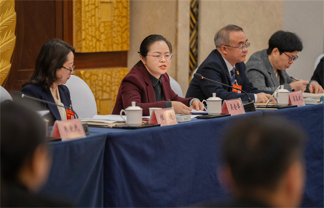 On February 3 afternoon, Yang Jing, a deputy from the Huaihua delegation, suggests on optimizing the business environment and promoting Hunan products to the overseas market. (Photo/Zhao Chi, Hunan Daily)