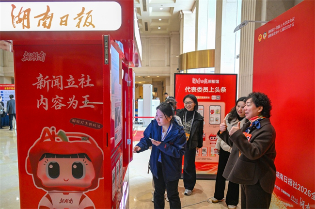 On February 1, some provincial people's congress deputies and CPPCC provincial committee members present at Hunan's annual "Two Sessions" trying out an automated newspaper photography machine.