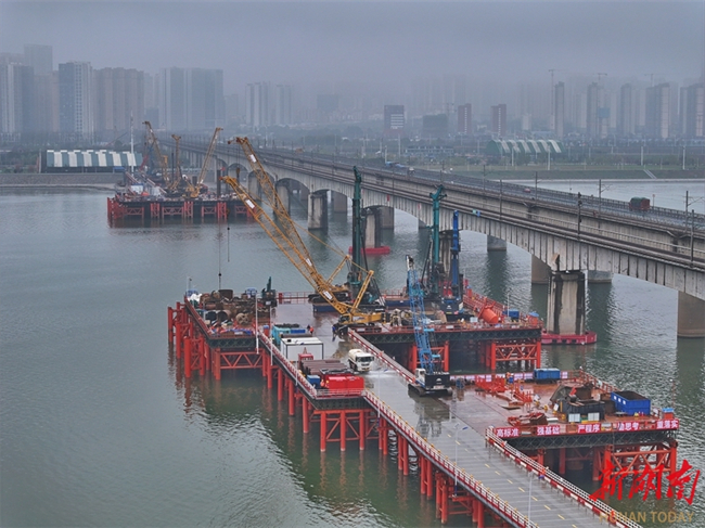 Construction of all 19 drilled piles for the No. 137 main pier of the Changsha Xiangjiang River Grand Rail-road Bridge has been completed by March 17. This rail-road bridge is a critical control project on the Changsha-Ganzhou High-speed Railway Hunan section. (Photo/Tong Di, Hunan Daily)