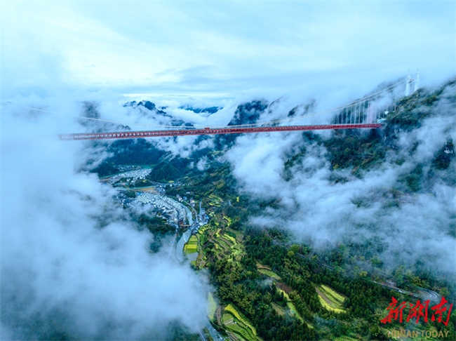 On March 18, the Aizhai Wonder Scenic Area is shrouded in clouds and mist after a rainfall. Aizhai Bridge looms in and out of view amid mist, transforming the landscape into an exquisite "Chinese ink wash painting." (Photo/Peng Jing)
