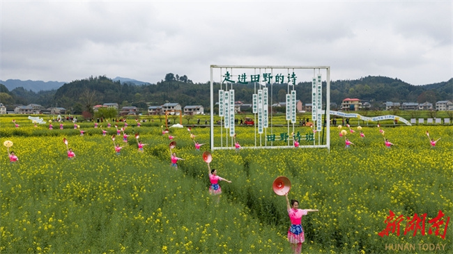 On March 28, the 2026 National Four Seasons Village Gala Demonstration Event kicked off at the Daoxiang Shitian Scenic Area in Baozi Town, Huitong County. Set against the natural backdrop of a vast sea of canola flowers, this immersive cultural event used village songs as the theme, blending agricultural customs, ethnic traditions, and melodies. It vividly showcased the poetic charm and vitality of rural areas in the new era, marking the spring prelude to the national "Four Season Village Gala" initiative. (Photo/Zhang Lei)
