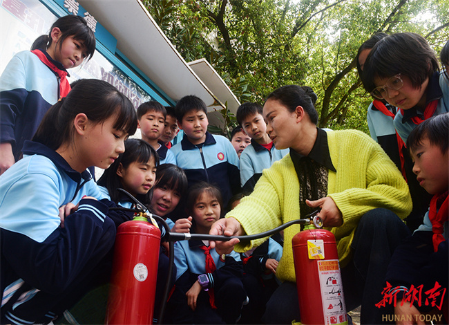 On March 30, teachers at Zunchong Primary School in Jiahe County demonstrated how to use fire extinguishers to their students. That day marked China's national safety education day for middle and primary school students. Many schools across the county organized a variety of activities to enhance student' safety awareness and self-protection skills, fostering a safe campus environment. (Photo/Huang Chuntao)