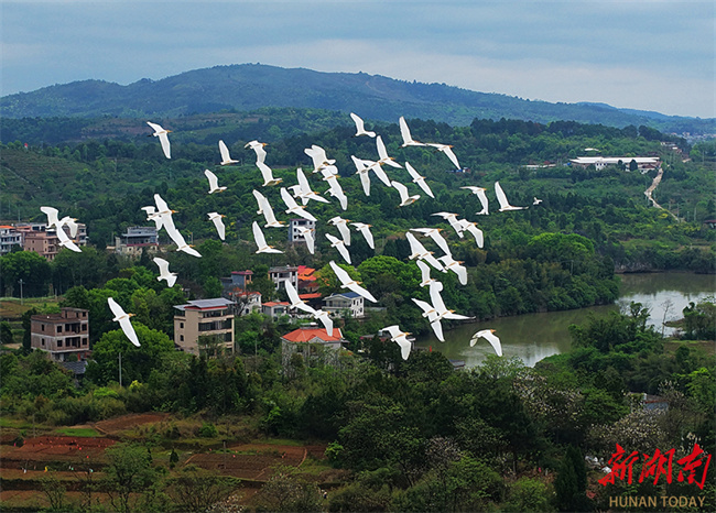 The photo, taken on April 7, shows flocks of birds flying along the banks of the Chongling River in Jiahe County. In recent years, the county authority has intensified efforts to improve the environment in both urban and rural areas, achieving continuous improvements in the living environment and natural ecosystems. The initiative has attracted large numbers of wild birds such as egrets to settle and breed in the area. (Photo/Huang Chuntao)