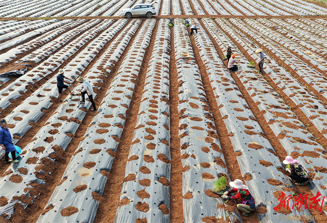 The photo, taken on April 9, shows farmers transplanting chili seedlings at a vegetable plantation in Longwang Village, Longtan Town, Jiahe County. In recent years, the town has focused on adjusting its agricultural industrial structure to develop a high-efficiency vegetable industry. It has rolled out an order-based planting model of "cooperatives + farmers + planting and harvesting + processing and sales", aiming to boost agricultural efficiency and increase farmers' income. (Photo/Huang Chuntao)