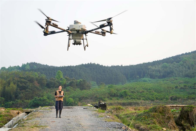 Luo Yu operates a drone in Huatang Town in Chenzhou, central China's Hunan Province, on April 9, 2026. (Xinhua/Xue Yuge)