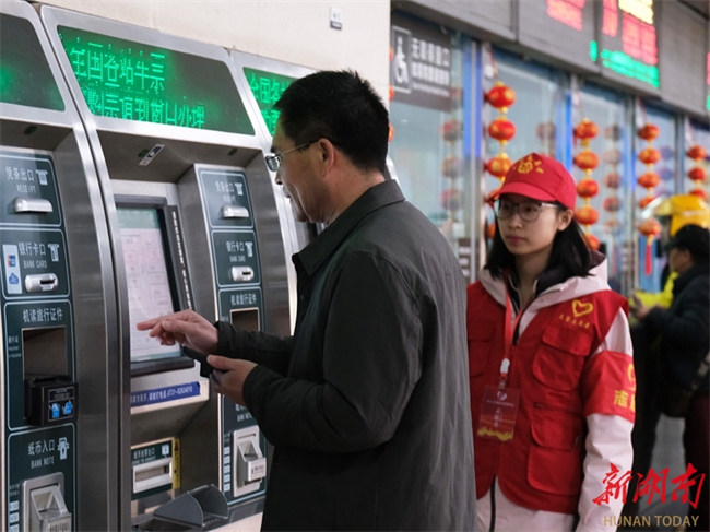 The photo, taken on February 2, shows volunteers providing guidance and inquiry services for travelers at the Changsha Railway Station.