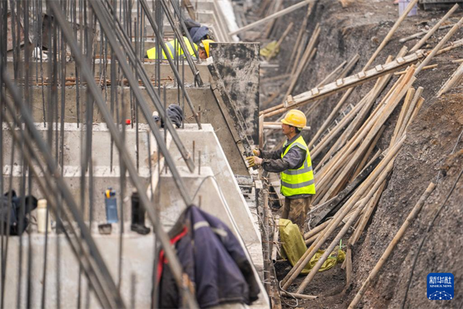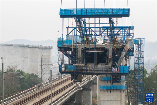 The photo shows workers from the China Railway No. 4 Engineering Group engaging in station building construction at the Shaoyang County Railway Station along the Shaoyang-Yongzhou High-speed Railway. (Photo/Chen Sihan, Xinhua)