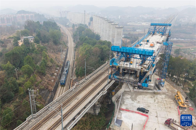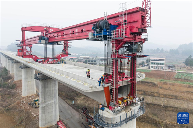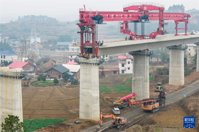 The drone photo shows a scene of continuous swivel beam construction on a grand bridge along the Shaoyang-Yongzhou High-speed Railway crossing over the Shanghai-Kunming Expressway. (Photo/Chen Sihan, Xinhua)