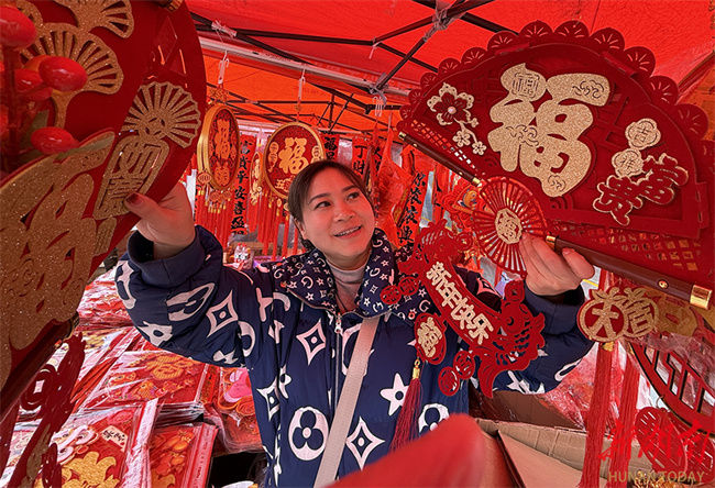 The photo, taken on February 8, shows a resident selecting decorations for the upcoming Spring Festival at a trade market in Tongdao Dong Autonomous County. Local trade markets experienced a shopping boom ahead of the Spring Festival, with a dazzling array of special purchases for the Chinese New Year and decorations themed around the Year of the Horse to meet residents' holiday demand. (Photo/Chen Junyu)