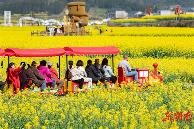 The photo, taken on March 5, shows tourists riding a sightseeing train through a sea of canola flowers at a scenic spot in Baozhi Town, Huitong County. That day marked the begining of "Jingzhe" or "Awakening of Insects," the third of the 24 solar terms on the Chinese lunar calendar. During this period, canola flowers, tulips, violets, and other spring blooms burst into vibrant colors, drawing crowds of visitors to admire the blossoms, take photos, and immerse in the vibrant spring atmosphere. (Photo/Zhang Lei)