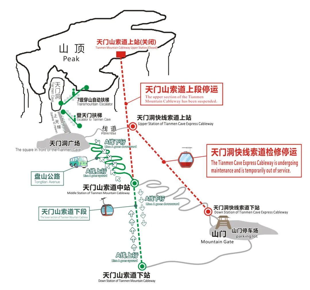 The route for Line A has also been adjusted. Visitors need to take the cable car from the lower station of the Tianmen Mountain Cableway to the middle station, then transfer to the scenic area shuttle bus to reach Tianmen Cave. From there, tourists can take the Transmountain Escalator to the mountaintop. After viewing the summit scenery, visitors can take the escalator back to Tianmen Cave, then take the shuttle bus to the middle station, and finally descend the mountain by a cable car.