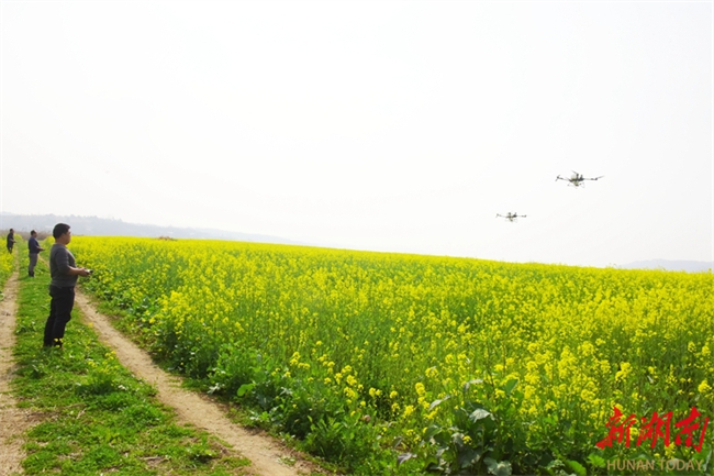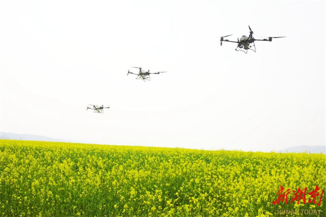 The photo shows plant protection drones conducting aerial operations over a canola flower field in Shizhuang Village, Huolianpo Town, Lixian County. The canola plants have entered a critical time for spring management recently. Taking advantage of the recent sunny weather, local farmers have been using drones to spray a mixture of pest control agents and foliar fertilizers, significantly enhancing field management efficiency and paving the way for a bumper harvest. (Photo/Bai Yipu)