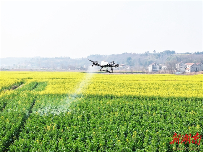 A plant protection drone conducts aerial operations over a canola flower field in Shizhuang Village, Huolianpo Town, Lixian County. The canola plants have entered a critical time for spring management recently. Taking advantage of the recent sunny weather, local farmers have been using drones to spray a mixture of pest control agents and foliar fertilizers, significantly enhancing field management efficiency and paving the way for a bumper harvest. (Photo/Bai Yipu)