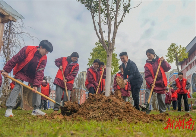 On March 11, students plant trees at the Yutan (Dongyang) School in Daoxian County. March 12 marks China's National Tree Planting Day. Voluntary tree-planting activities are being held across the province, to increase green coverage, boost ecological protection, and jointly build a beautiful homeland. (Photo/Jiang Keqing and Jiang Pingjiao)