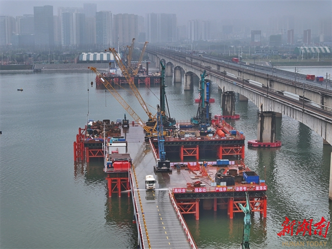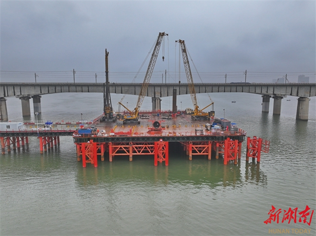 Construction of all 19 drilled piles for the No. 137 main pier of the Changsha Xiangjiang River Grand Rail-road Bridge has been completed by March 17. This rail-road bridge is a critical control project on the Changsha-Ganzhou High-speed Railway Hunan section. (Photo/Tong Di, Hunan Daily)