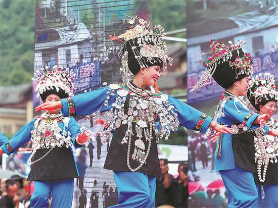 Miao women dressed in traditional ethnic attire and wearing full sets of silver ornaments dance during the Double Sixth Festival in Fenghuang County, Hunan Province, on June 30. (HUANG WENYUAN/FOR CHINA DAILY)