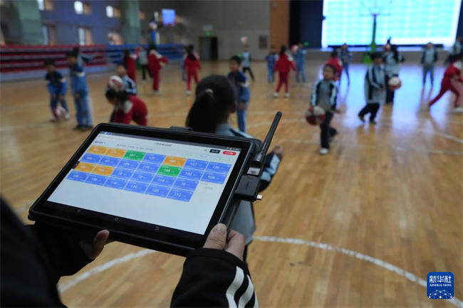 A teacher monitored students' heart rates on a tablet during a physical education class at Leifeng Primary School in the Hunan Xiangjiang New Area. (Photo/Xue Yuge, Xinhua)
