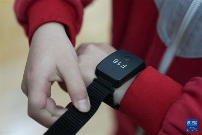 A student wore heart rate monitoring wristband during a physical education class at Leifeng Primary School in the Hunan Xiangjiang New Area. (Photo/Xue Yuge, Xinhua)
