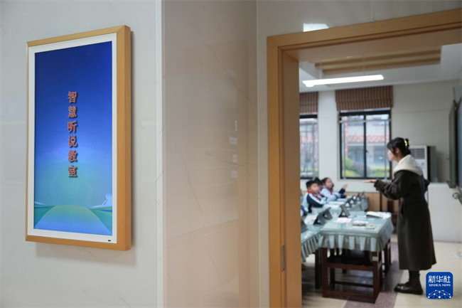 A teacher gave an English class in an intelligent listening and speaking classroom at Leifeng Primary School in the Hunan Xiangjiang New Area. (Photo/Xue Yuge, Xinhua)