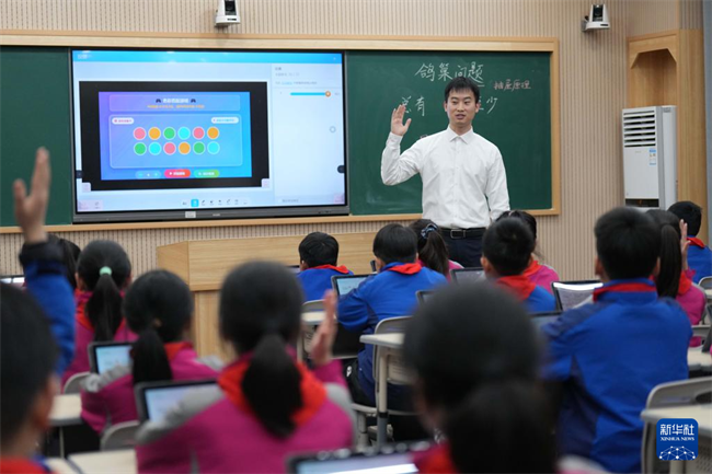 A teacher used interactive presentation software to visualize abstract mathematical concepts during a math class at Leifeng Primary School in the Hunan Xiangjiang New Area, helping students grasp them more easily. (Photo/Xue Yuge)