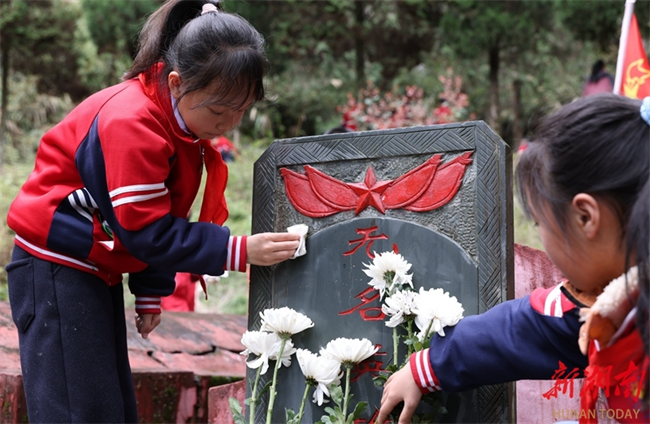 Students of the Liya Primary School of Tongdao Dong Autonomous County clean a tombstone at the martyrs' cemetery in the county on April 1. As the Tomb-sweeping Day is approaching, people across the province are organizing various forms of memorial activities to commemorate revolutionary martyrs, carrying forward the spirit of heroes and fostering affection for the country. (Photo/Su Yongzhu)