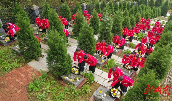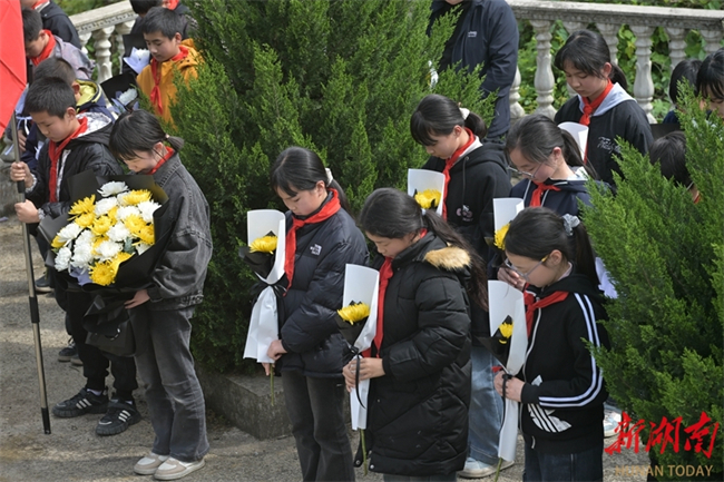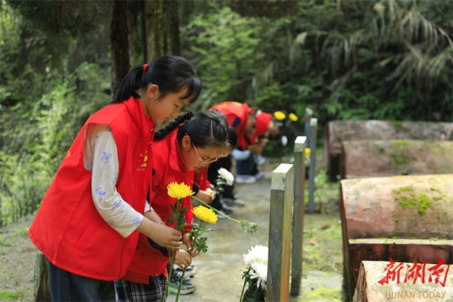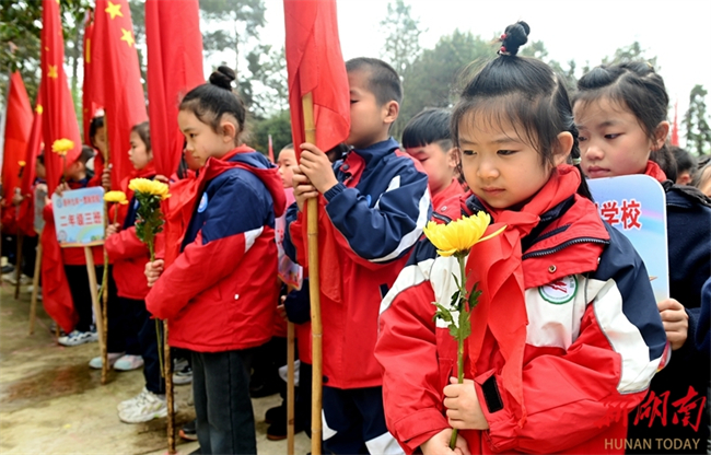 Students of the Dongfanghong Primary School in Longhui County offer flowers to martyrs at the martyrs' cemetery in the county on April 1. As the Tomb-sweeping Day is approaching, people across the province are organizing various forms of memorial activities to commemorate revolutionary martyrs, carrying forward the spirit of heroes and fostering affection for the country. (Photo/Zeng Yong)