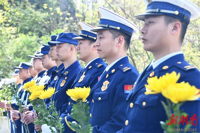 Firefighters of the firefighting and rescue team in Jiangyong County pay tribute to martyrs at the martyrs' cemetery in the county on April 1. As the Tomb-sweeping Day is approaching, people across the province are organizing various forms of memorial activities to commemorate revolutionary martyrs, carrying forward the spirit of heroes and fostering affection for the country. (Photo/Tian Rurui)