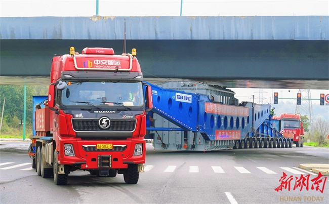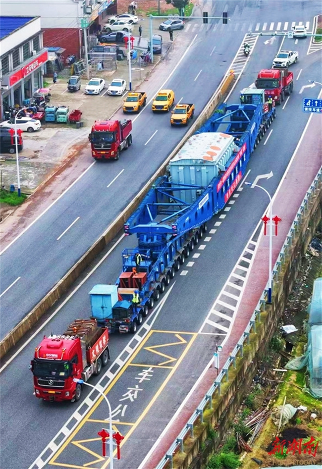 After an arduous journey, the second main transformer for the expansion project of the Changsha 1,000 kV UHV substation arrived in Changsha County at 13:00 on April 1. This transformer is a core component of the national key power transmission project which aims at improving a "日"-shaped UHV AC ring network in Central China. This transformer was carried by a "behemoth" tractor-trailer, together weighing 445 tonnes. The tractor-trailer measured 100 meters in length, 5.224 meters in width, and 4.95 meters in height, featuring 42 axles and 276 wheels. It was trailed by two tractors with over 600 horsepower, one pulling from the front and the other pushing from the rear. The entire journey was escorted by the Changsha Municipal Transportation Bureau and organized by the Changsha Transportation Comprehensive Law Enforcement Detachment. The journey started from Hengyang on March 30. (Photo/Xu Xing and Chen Yihong, Hunan Daily)
