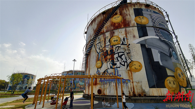 The photo shows residents enjoying leisure time at a square of a lakeside landscape project of Yueyang Jijia Lake Comprehensive Environmental Treatment Project PhaseⅠ. The environmental treatment project innovatively repurposed some facilities from the Qilishan Tank Farm of the SINOPEC Hunan Company, transforming old tanks into a popular photo spot through graffiti art. The site has emerged as a new springtime destination for locals. (Photo/Peng Zhan)