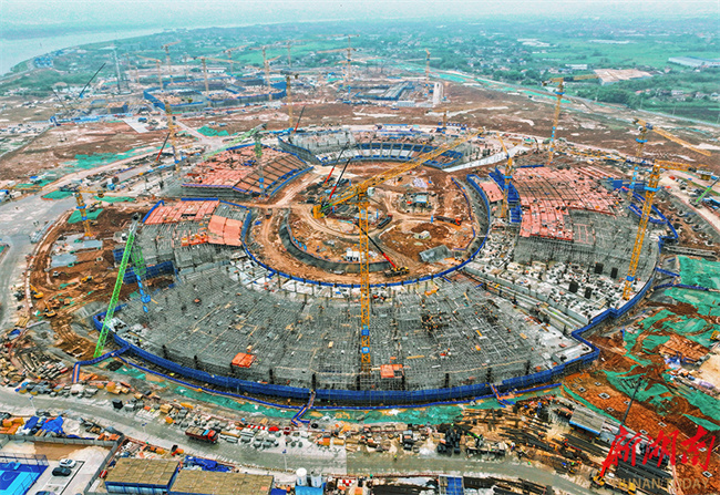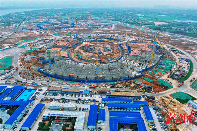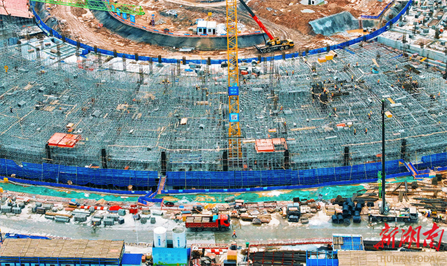 On April 10, construction workers seized the fine weather to work intensively at the construction site of the Changsha Olympic Sports Center project which is comprised of "one stadium, a gymnasium, and a natatorium." With heavy machinery operating in an orderly manner, the construction site was bustling with activity. As a key provincial project and the main venue for the 2029 National Games, the project is developed by the Changsha Urban Development Group and constructed by the China Construction Third Engineering Bureau, China Construction Fifth Engineering Bureau, and other contractors. It is the largest and most modernized comprehensive sports venue in Hunan Province, as well as a landmark project for promoting the integrated development of the Changsha-Zhuzhou-Xiangtan metropolitan area and building the province into a sports powerhouse. As a major venue for the 16th National Games, the project is scheduled for completion in 2028. (Photo/Xu Xing, Hunan Daily)