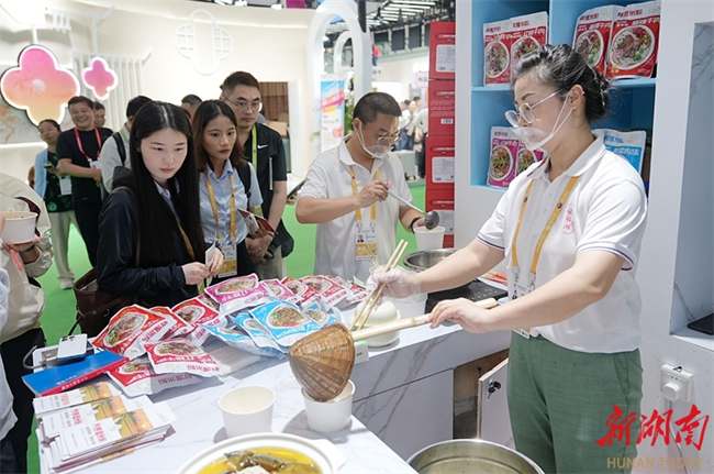 The sixth China International Consumer Products Expo (CICPE) is currently being held in Hainan Province. Under the theme "Empowerment through Openness, Hunan Trade Goes Global," the Hunan delegation set up a 500-square-meter Hunan Image Pavilion, with 43 Hunan enterprises participating. The photo, taken on April 13, shows people queuing for tasting Changde rice noodles. (Photo/Fu Cong, Hunan Daily)
